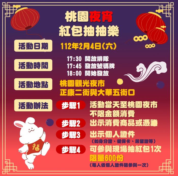 桃園市長張善政表示,元宵節在傳統節慶中有「小過年」的寓意,為延續農曆新年的熱鬧氣氛,今年首度規劃一系列慶元宵活動與民眾互動,增進民眾前往桃園觀光夜市踩點的趣味性。第一慶「我來桃園夜宵大街,走春抽好禮」活動,民眾只要於2月19日前至桃園觀光夜市與街區燈籠或活動布條合照,並至「桃園有好市」臉書粉絲專頁指定貼文中上傳照片並完成指定任務,就有機會獲得限量桃園觀光夜市抵用金500元;第二慶「猜燈謎,慶元宵」活動,於1月30日至2月3日止,每天晚上6點於「桃園有好市」臉書舉辦線上猜燈謎活動,民眾於指定時間內至貼文下方回答正確答案,即有機會可獲得2,000元桃園觀光夜市抵用金;第三慶「桃園夜宵紅包抽抽樂」,2月4日(六)民眾至桃園觀光夜市不限金額消費,於活動現場(正康二街與大華五街口)出示消費商品或憑證以及個人證件,即可參與現場抽紅包1次,可獲得100元至1,000元的夜市抵用金(每人1份,限量600份),使用期限至112年3月31日止,邀請民眾一同來桃園觀光夜市歡慶元宵節。