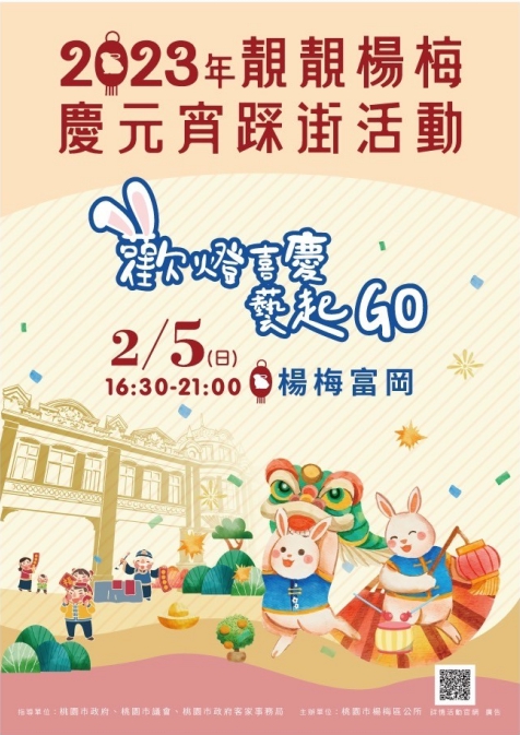 吉兔迎福春光暖,鴻兔大展吉兆顯,告別了福虎生風的壬寅虎年,配合2023桃園燈會在富岡,楊梅區公所特別規劃了「2023年靚靚楊梅慶元宵-歡燈喜慶藝起GO」踩街活動,帶領楊梅區各里辦公處及社區發展協會一起變裝踩街,與遊客們一起熱鬧慶元宵。