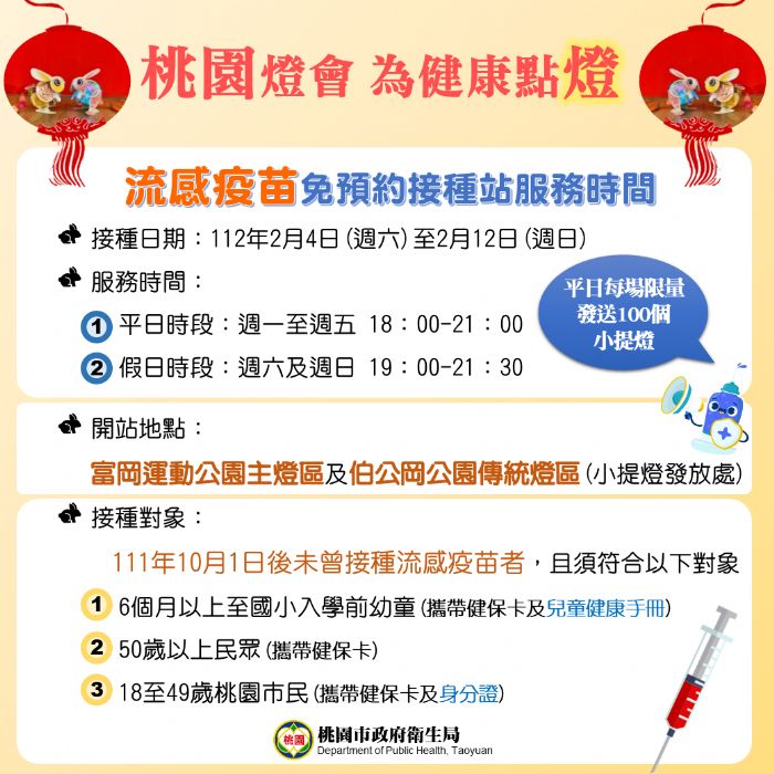 今年桃園燈會在楊梅區舉辦,桃園市政府衛生局自2月4日至12日晚上在主燈區(富岡運動公園)及傳統燈區(伯公岡公園)小提燈發放處,設置公費流感疫苗接種站,另外於2月6日至10日再加碼贈送桃園幸福兔提燈,每場次每日限量100個,數量有限送完為止。衛生局提醒符合公費流感接種條件,111年10月1日以後尚未接種流感疫苗的民眾,把握機會踴躍前往接種,提升自身保護力。
