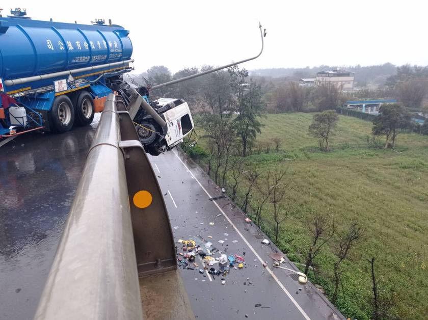 楊梅交通分隊分隊長顏鉦融表示,5日6時51分新屋區台61線南下47K處,許姓男子(40歲)駕駛自用連結車由北往南方向行駛高架道路,因不明原因擦撞路肩護欄,導致車輛懸掛於高架橋上。