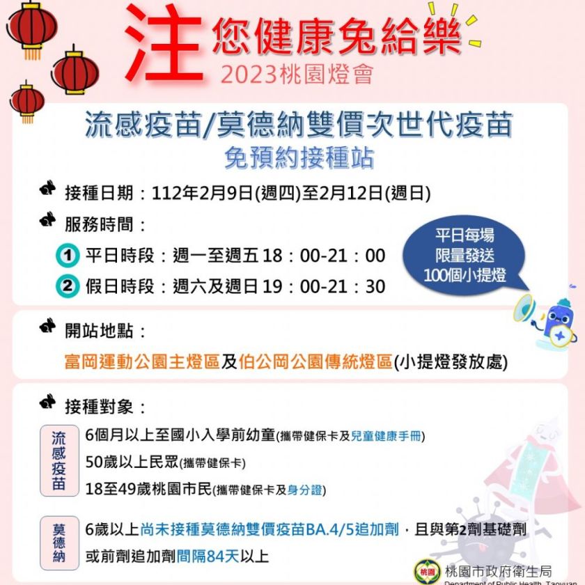 「賞燈會、打疫苗、護健康」,提升全家群體免疫力,衛生局在2月9日至12日晚上2023桃園燈會主燈區(富岡運動公園)及傳統燈區(伯公岡公園)小提燈發放處,提供快速便利的疫苗接種服務,接種流感疫苗,再增加莫德納雙價次世代疫苗免預約接種服務,2月9、10兩日完成接種者加贈桃園幸福兔提燈,每日限量100個,數量有限送完為止。