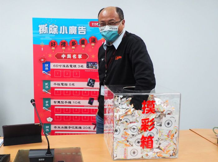 桃園環保局首創之「撕小廣告換好禮」活動,於111年桃園市民約撕除12,970公斤(約129萬張)的違規廣告單,民眾參與相當踴躍,共兌換約12萬元的禮券與21萬元的市民卡加值金,同時發放了6,482張抽獎券。環保局長陳世偉也於今(15)日公開抽出3部價值3萬多元的65吋液晶電視等大獎。