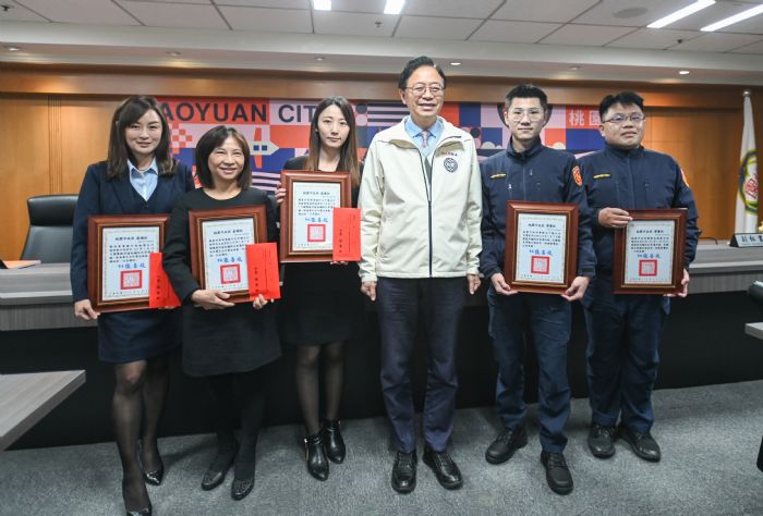 桃園市長張善政15日上午主持市政會議,表揚「桃園市112年1月成功攔阻特殊重大詐騙案件有功人員」。張市長表示,今日共表揚3名有功銀行人員及市府警察局2名有功員警,感謝他們發揮警覺性,成功攔阻詐騙,相當值得嘉許。
