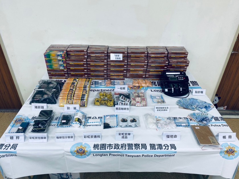 警方當場逮捕26歲李姓、34歲羅姓主嫌及其他2名共犯等人到案,並查扣毒品咖啡包197包(毛重700公克)、一粒眠5包(687公克)、愷他命23包(毛重60.12公克)、電子磅秤6台、彩虹菸33支、彩虹菸草、香草粉、分裝袋、空煙管、捲菸器、電子磅秤、點鈔機、帳冊、手機8支以及現金6萬餘元等相關贓證物,訊後全案依違反毒品危害防制條例罪嫌,移送臺灣桃園地方檢察署偵辦。