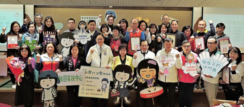 桃園市市長張善政(前排左四)與桃園市政府社會局局長陳寶民(前排右五)、桃園市政府社會局副局長許敏松((前排右三)、桃園家扶中心主任張伏杉(前排右二)與貴賓、榮退及資深寄養家庭合影。