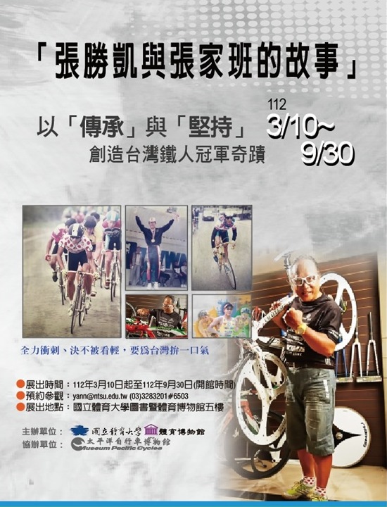 我國知名運動團體「張家班鐵人隊」,由前自由車國手張勝凱攜手三位子女-張嘉家、張婷婷及張家豪,自2009年投入鐵人三項競賽屢獲佳績,甫於去年10月達成累積三百金團隊目標,為台灣鐵人運動締造卓越的里程碑。後與太平洋自行車博物館、自行車智能訓練台品牌XPEDO合作,於2022/12/23-2023/01/08展出「張家班鐵人300金特展」,展出張家班成軍14年,團隊攜手與共、勇敢逐夢的豐碩成果,也記錄近年台灣自行車、鐵人運動發展及選手培育的過程。