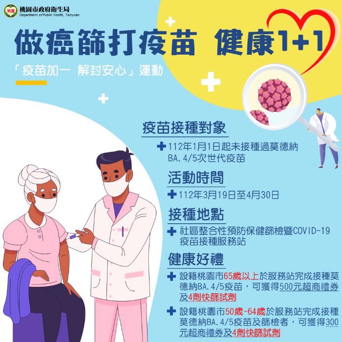 響應疫苗加1,解封安心政策,4月底前除了設籍桃園市65歲以上長者,於社區接種站施打新冠疫苗追加劑可領取500元禮券,再加碼設籍本市50至64歲民眾於指定整篩服務站接受任一整篩項目(成人健檢/子抹/乳攝/口腔抹片/糞便潛血)「且」現場接種COVID-19疫苗追加劑,即可領取300元禮券加4劑快篩。