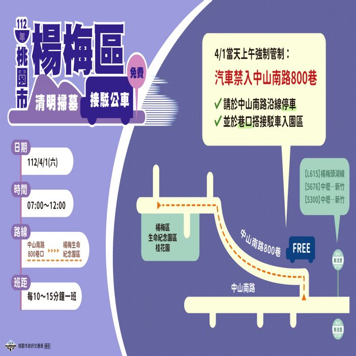 清明節將至,為方便民眾祭祖掃墓,桃園市政府於楊梅、蘆竹、八德、龜山區提供清明掃墓接駁專車,免費接送掃墓民眾往返墓區,以減少民眾使用私人運具,歡迎掃墓民眾多加利用。