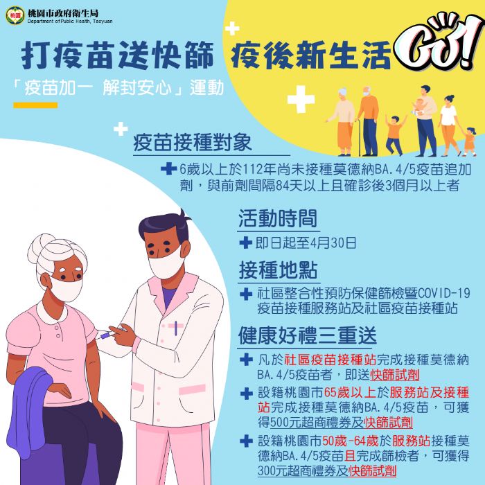 響應疫苗加一,邁向疫後新生活,桃園市衛生局提供市民友善便利的健康加碼免預約接種站,一次公布至4月30日前社區設站資訊,供民眾選擇就近的服務點接種COVID-19疫苗或預防保健篩檢,民眾只要至指定接種站完成COVID-19疫苗追加劑接種就送快篩試劑,另設籍桃園市65歲以上長者再加送500元禮券,50至64歲民眾於指定整篩服務站接受任一整篩項目(成人健檢/子抹/乳攝/口腔抹片/糞便潛血)「且」接種COVID-19疫苗追加劑,可額外獲得300元禮券。