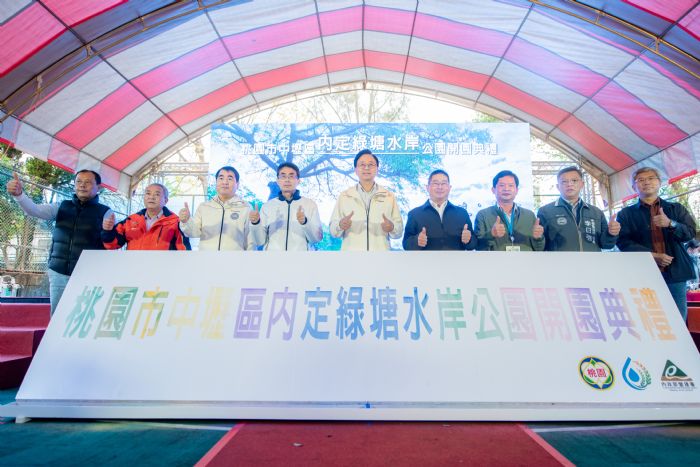 桃園市長張善政(7)日下午前往中壢區,出席「內定綠塘水岸公園開園典禮」。張市長表示,桃園大圳系統4-2號埤塘景觀改善工程花費許多心思,感謝行政院農委會農田水利署、內政部營建署與市府共同合作改善埤塘環境,打造為「內定綠塘水岸公園」,提供民眾休憩、觀景與生態保護的美好空間。本案工程總經費5,542萬元,農水署分擔1,500萬元、營建署補助650萬元,其餘由市府預算支應,「內定綠塘水岸公園」於今(112)年1月竣工,今日正式開園啟用。