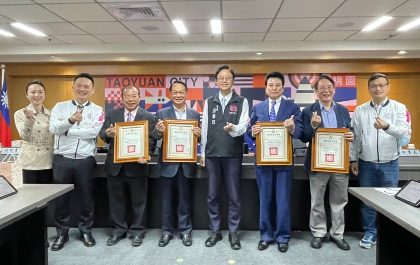 桃園市長張善政於市政會議頒發世界客家博覽會海內外社團顧問(左3黃茂實,左4呂學樟,右3范成連,右2丘尚英)聘書及介紹世客博發言人-陳曉卿(左1)。
