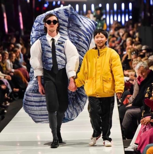 衣啟飛翔創客基地設計師梁宗琳(右)以作品「城市難民Urban Refugees」(左)獲紐西蘭「2023 ID International Emerging Designers Awards國際新銳設計師大獎」冠軍,圖為走秀照片。