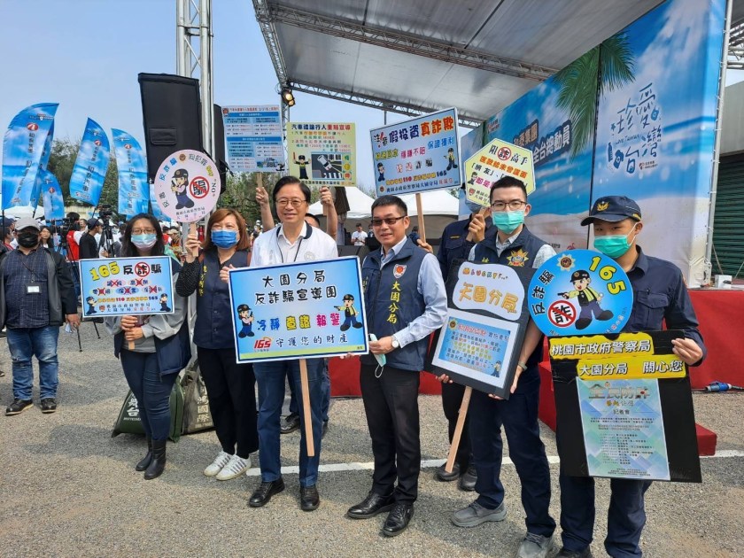 大園分局於此別具意義淨灘活動會場設置攤位,向員工們解析各類詐騙類型、勿酒後駕車及汽車行經行人穿越道要暫停禮讓行人優先通過等交通宣導,藉以提醒現場參與活動人員與遊客,提升全民反詐及交通安全意識。