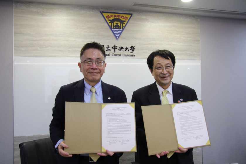 中央大學周景揚校長(左)與日本筑波大學校長永田恭介(右)簽署學術交流合作與交換學生協議。