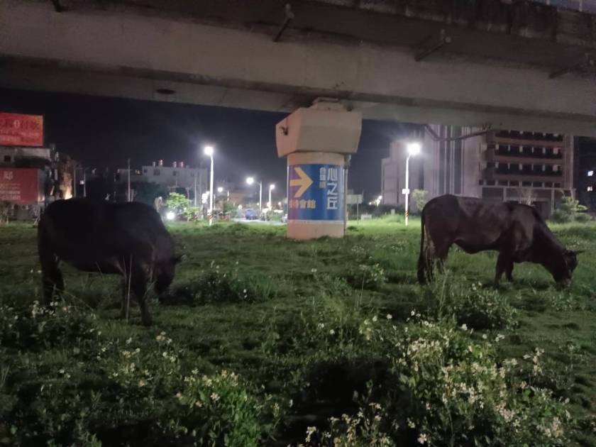 員警26日凌晨1時在蘆竹區南山路段巡邏時,驚見竟有2頭臺灣黃牛正在馬路上悠哉吃草閒逛,為了防止發生交通事故與維持交通秩序,員警趕緊通知飼主前來處置,並協助將這2頭臺灣黃牛驅離道路,引導回窩。