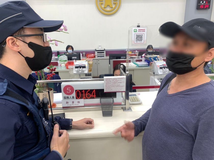 桃園市一名鍾姓男子28日下午前往平鎮區環南路臺灣銀行辦理匯款,由於男子臨櫃填單時神情慌張,且邊講電話邊填寫匯款單,面對行員的關懷提問也置之不理,行員察覺有異,立即通報員警到場協助,經過員警及行員不斷的勸說,才及時成功阻詐。