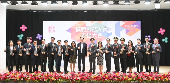 桃園市長張善政11日下午於桃園市綜合會議廳,出席「桃園市112年模範公務人員表揚大會」,並頒發獨一無二的「全身客製化公仔獎座」給17位獲獎的模範公務人員。張市長表示,今(112)年獲得模範公務人員的同仁是由各機關首長推薦,再由審議小組審查後脫穎而出,獲獎事蹟都非常優秀,他以每一位得獎者為傲。張市長肯定今日獲獎的每位同仁都投入心血,盡力推動市政,他們在公務上的付出遠比獎項更有價值,期許市府同仁持續努力,打造桃園市政府成為最優秀的模範公務單位。