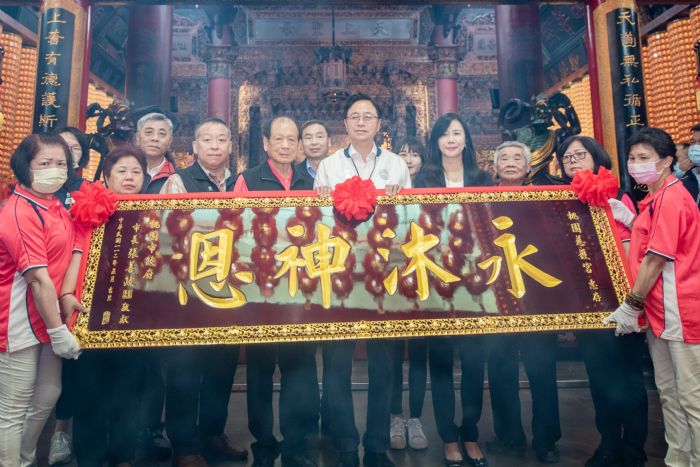 張市長指出,今日是媽祖聖誕,因此特別前來致贈「永沐神恩」匾額1座,感謝慈護宮與市府長期合作推動公益工作,未來也希望廟方持續推動公益,讓桃園變得更好,並期盼媽祖神恩庇佑慈護宮及所有鄉親。