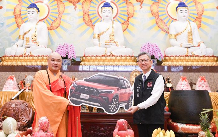 桃園市副市長王明鉅26日上午前往桃園區,出席「財團法人桃園佛教蓮社捐贈災情勘查車及防水電動油壓剪典禮」。王副市長表示,「工欲善其事,必先利其器」,感謝桃園佛教蓮社的愛心及善心,捐贈市府消防局災情勘查車1輛及防水電動油壓剪2組,此次受贈的車輛及器材將可大幅提升消防同仁救災效率,讓桃園市民享有更安全、更有保障的生活。