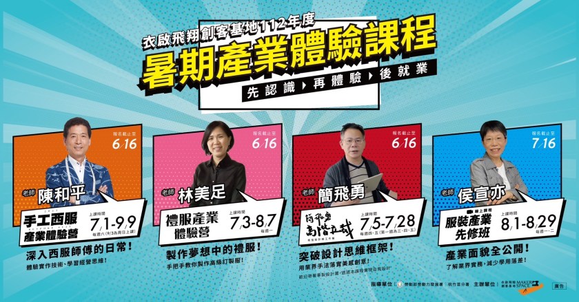 因應畢業求職季的到來,為了協助服裝相關科系的學生和畢業生提前了解和體驗相關產業技術,勞動部勞動力發展署桃竹苗分署「衣啟飛翔創客基地」特別邀請超過30年以上經驗的服裝產業專家名人組成頂尖師資群,在暑假期間辦理一系列產業體驗課程,包括「手工西服體驗營」、「禮服產業體驗營」、「高階立裁版型設計師工作營」 (以上均為6/16報名截止);此外,為推廣讓民眾了解服裝產業,特別規劃「服裝產業先修班」(7/16報名截止)線上課程,以上課程均免費培訓,自即日起報名,歡迎有興趣的民眾可至「衣啟飛翔創客基地」臉書粉絲專頁查詢及報名。