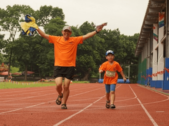 親子體驗組參賽的父子檔即將通過終點時臉上笑容洋溢。
