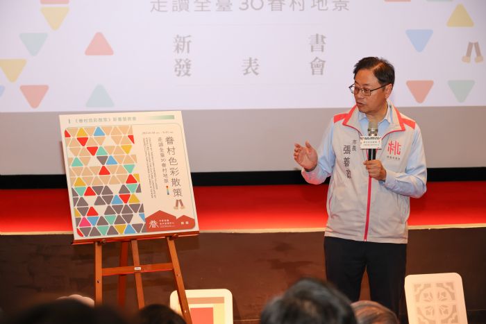 桃園市長張善政16日下午前往中壢光影電影館,出席《眷村色彩散策-走讀全臺30眷村地景》新書發表會。張市長表示,《眷村色彩散策-走讀全臺30眷村地景》是市府文化局與榮民榮眷基金會合作的成果,本書委託中原大學團隊進行研究調查,歷時3年走訪全臺眷村蒐集資料,從南到北選出30個具代表性的眷村,以色彩特色為主題,呈現各眷村的文化風貌,帶領讀者藉由色彩認識眷村文化。