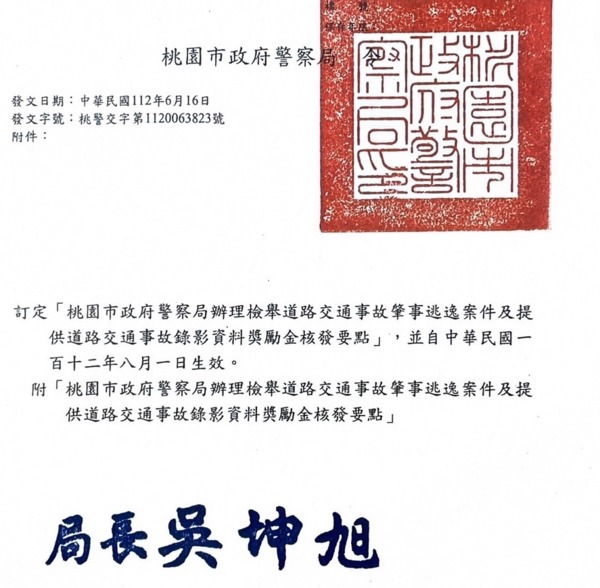 桃園市政府警察局為鼓勵民眾檢舉轄內道路交通事故肇事逃逸案件或提供道路交通事故錄影資料,以釐清肇事原因,確保民眾生命、身體、財產安全,訂定「桃園市政府警察局辦理檢舉道路交通事故肇事逃逸案件及提供道路交通事故錄影資料獎勵金核發要點」,並自112年8月1日正式生效。