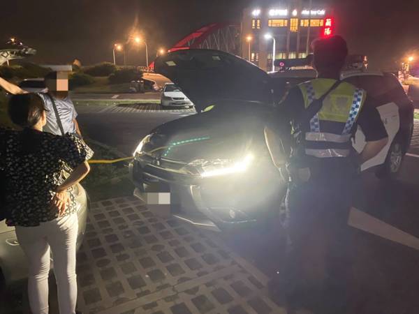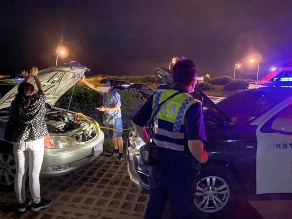 大園分局竹圍派出所警員李美雯、盧胤學、林俊青,27日19時許在竹圍漁港巡邏時,發現一輛自小客車引擎蓋掀開停在北堤停車場,車子旁還有一對男女在邊打電話邊檢查車輛狀況,似乎需要協助,員警見狀立即上前關心。