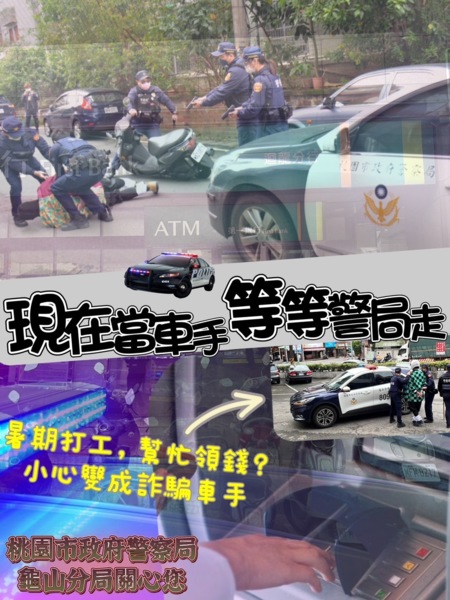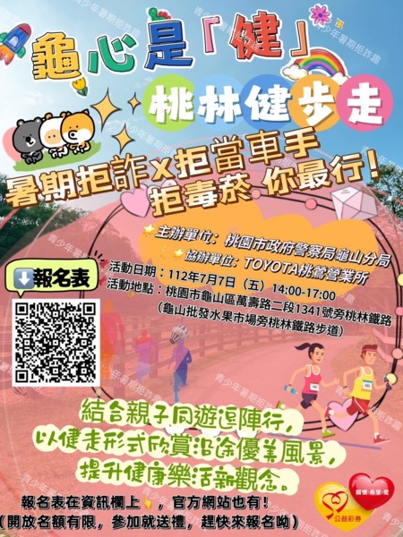 內政部警政署結合刑事警察局與警察廣播電臺,邀請許多藝人拍攝一系列「百工百業,全民防詐」宣導短片,避免民眾落入詐騙集團圈套,讓民眾了解最新詐騙手法及型態,龜山分局也非常用心規劃反詐騙宣導活動,將於7月7日舉辦【「龜」心是健,桃林健步走】健走活動,以暑假青少年打工求職,容易淪為詐騙集團成員或擔任詐欺車手為主題,透過健康樂活健走活動,引導青少年建立正確觀念。