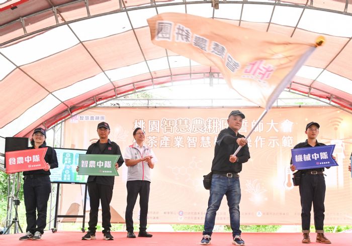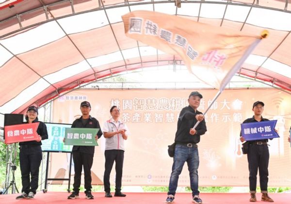 桃園市長張善政3日上午前往龍潭區,出席「桃園智慧農耕團誓師大會」,並授旗予智慧農耕團大隊長廖俊融,象徵桃園智慧農耕團正式成軍。張市長表示,桃園率先全國,輔導青農成立「桃園智慧農耕團」,並分為「智農中隊」、「機械中隊」、「食農中隊」及「淨零循環中隊」4個中隊,今日正式啟動,成為桃園智慧農業發展的重要里程碑。