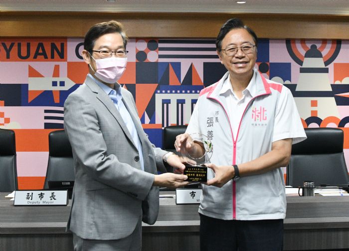 張市長表揚中原大學順利辦理「112年全國大專校院運動會」,由主任秘書閻亢宗教授代表受獎。