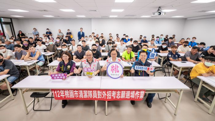 桃園市長張善政12日上午前往桃園市勞工教育大樓,勉勵桃園市清潔大隊新進人員。張市長表示,今(112)年清潔隊員招考,吸引共4,145名考生報名,原定錄取名額為450名,因有2人同分,故增額錄取1名,總計錄取451名,預計分3年進用完畢。張市長指出,今日為新進人員放榜後選填志願的日子,恭喜上榜的優秀考生,並歡迎準清潔隊員們一起加入桃園市政府這個大家庭,為打造更乾淨、宜居的桃園努力。