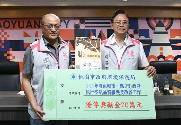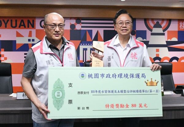 桃園市長張善政12日上午主持市政會議,接受環保局呈獻榮獲「111年度環境保護績效考核績優機關」。張市長表示,環保局在行政院環境保護署的環境保護績效考核,榮獲9座獎項殊榮,包括「環境保護績效考核總成績」特優、「環境影響評估與環境教育考核」特優、「水質保護及土壤整治考核」特優、「資源循環考核」特優、「推動因應氣候變遷行動考核」特優、「淨零綠生活考核」特優、「環境測定及綜合業務考核」優等、「垃圾處理及環境管理考核」優等及「空品維護與噪音管制績效考核」優等,整體表現優異值得讚許,期勉環保局持續引入科技、創新環保作為,為桃園爭取更多榮耀。