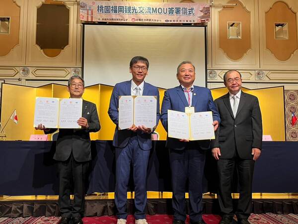 桃園市政府觀光旅遊局率桃園市旅館商業同業公會至日本九州地區推展桃園觀光旅遊,13日於福岡市,在台北駐福岡經濟文化辦事處陳銘俊處長的見證下,桃園市政府觀光旅遊局周柏吟局長、桃園市旅館商業同業公會邱照進理事長與福岡縣旅行業協會真武祐一會長簽訂三方觀光合作備忘錄(MOU),未來將針對自由行、團體旅遊及修學旅行等客群,透過兩地政府單位、旅館業及旅行業等產業公協會間之觀光經驗分享、旅遊產品包裝及行銷宣傳等多面向合作,深化觀光旅遊交流,為桃園及福岡兩地觀光開創國際新視野。