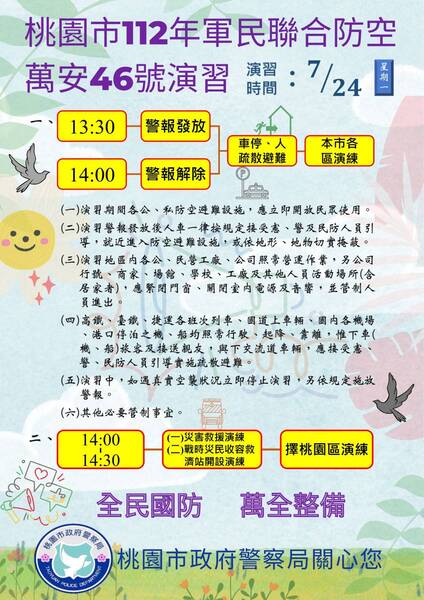 112年度軍民聯合防空(萬安46號)演習採「有預警、分區同時段」方式實施,本市屬北部地區,訂於7月24日(星期一)13時30分至14時實施30分鐘警報傳遞與發放、疏散避難、交通及其他必要管制,屆時請民眾務必配合警報之發放,就地實施疏散避難演練;另14時至14時30分在桃園區實施災害救援(中油桃園煉油廠)及戰時災民收容救濟站開設(快樂國小)等30分鐘實作演練。