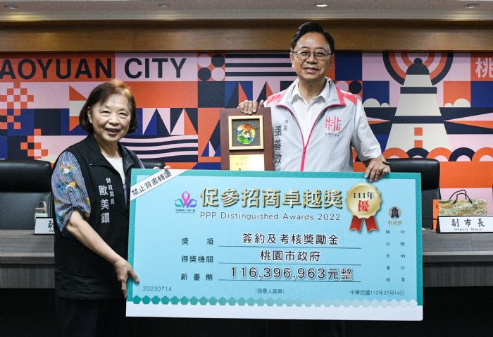 歐局長也指出,去(111)年度本府簽約促參案共計16件,包含:北區水資中心再生水BTO案等2件水利設施、中壢高鐵特定區停三、停四停車場BOT案等5件交通建設、電影映演設施OT案等5件文教設施、楊梅跆拳道暨運動場館OT案等3件運動設施,以及新屋後湖溪生態園區OT案之觀光遊憩設施等,簽約件數為全國第一名,民間投資金額高達103億元,榮獲促參類招商卓越獎,並獲頒簽約獎勵金1.16億元。此外,財政部也於去年首次召開「111年促進民間參與公共建設業務考核計畫」考核會議,本府榮獲優等的肯定,獲頒促參業務考核獎金30萬元。