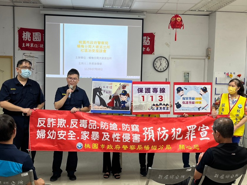楊梅分局大坡派出所所長徐偉修為落實推動社區警政再出發工作,加強宣導婦幼安全及反詐騙等宣導,以強化民眾婦幼安全及犯罪預防等觀念,於日前至後庄社區活動中心辦理「家庭暴力、性騷擾、跟蹤騷擾、兒童及少年性剝削、交通安全及反詐欺」防制會議,現場有大坡里里長陳俊良、蚵間里里長彭小林、望間里里長彭勝來及社區民眾約50名熱情參與。