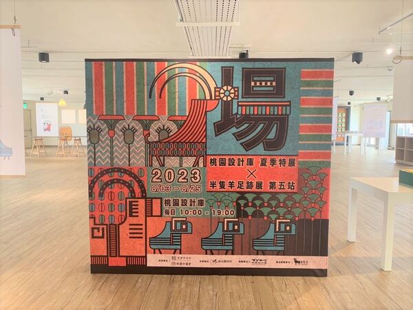 「桃園設計庫X半隻羊足跡展」,主視覺牆呈現古老壁畫的青年創意風格意象。