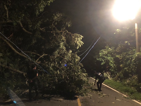 龍潭警分局4日凌晨,接獲民眾報稱在龍潭區粗坑路、竹龍路等路段受到颱風的影響,路樹不敵強風襲擊分別倒塌於路面及懸掛在電線桿上,期間一度造成道路中斷,不但妨礙了交通也危及用路人安全,員警獲報後立即趕赴現場處理,所幸均未造成人車損傷。