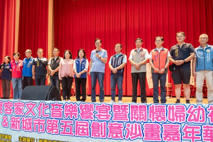 桃園市長張善政12日上午前往楊梅區,出席「客家文化音樂饗宴暨關懷婦幼社會福利&新城市第五屆創意沙畫嘉年華」。張市長表示,楊梅區新城市促進會主辦結合客家文化音樂與兒童創意沙畫的活動,現場反應熱烈,每張桌子都客滿,剛剛逐桌參觀了小朋友們的沙畫創作,作品都很有意思,也看到大家玩得非常盡興,感謝在地議員、里長及協會用心籌辦,也感謝各位鄉親、家長和小朋友們一同支持這項有意義的活動。