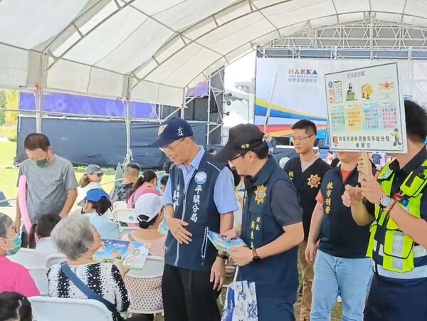 桃園市平鎮警分局為了宣導防詐觀念,12日趁著「2023世界客家博覽會」機會,分局長吳明彥特別帶領同仁前往乙未保台紀念公園對觀展的市民朋友進行宣導,希望透過強力的宣導,讓民眾對於詐騙手法有所辨識而免於遭詐的風險。