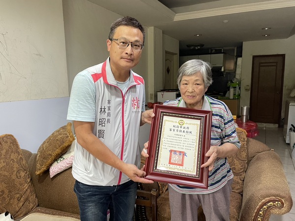 客家局長林昭賢代表張善政市長,頒發故楊政道老師之客家貢獻表揚狀予其母親-楊吳甜妹。