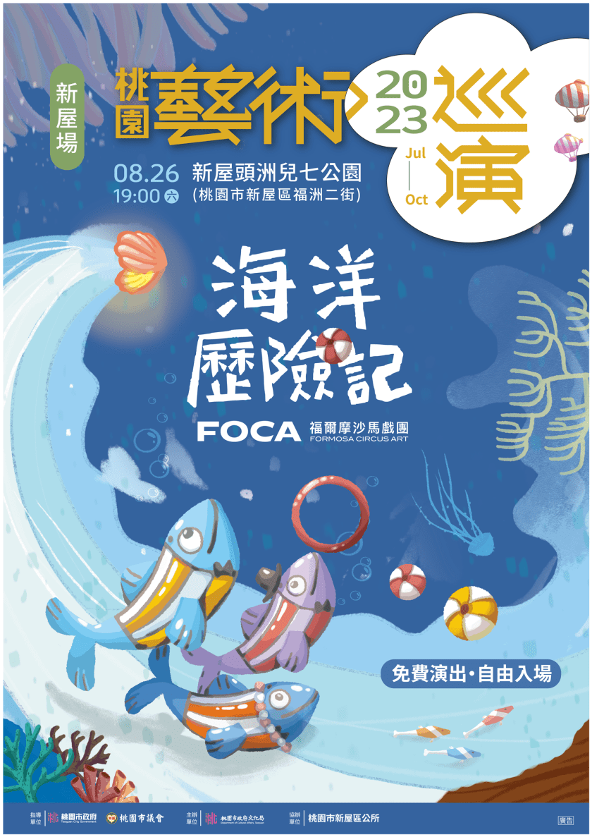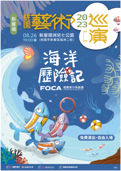 桃園市政府文化局全力推動「文化平權」與「文化近用權」的重要理念,透過策劃一年一度的「桃園藝術巡演活動」,為偏遠鄉村導入精采絕倫的藝文表演,讓更多當地居民也能就近欣賞優質演出,享受被藝術豐富的生活。7月份在復興區及觀音區的藝術巡演,吸引了超過2千名觀眾共襄盛舉,在熱烈的掌聲與情感的共鳴中圓滿結束。桃園市政府文化局再次誠摯地邀請各位市民朋友,112年8月26日(六)晚間7點,一同前來新屋頭州兒七公園,欣賞FOCA福爾摩沙馬戲團帶來的《海洋歷險記》,在精彩絕倫的表演中為仲夏留下美好回憶。