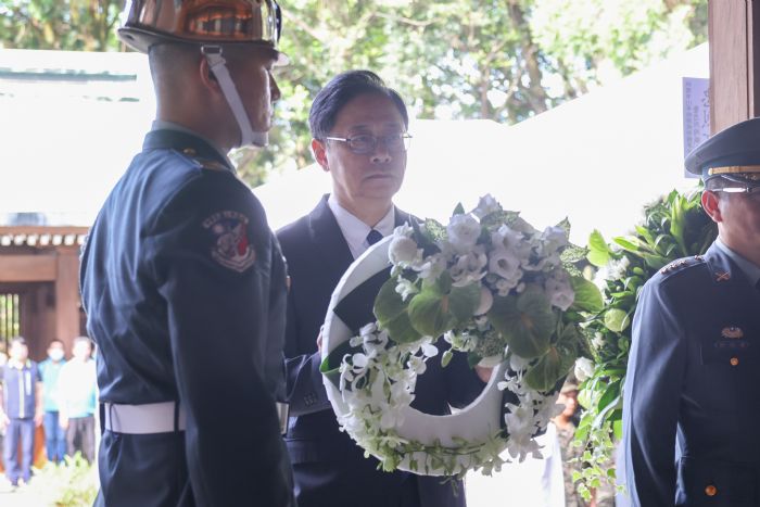 桃園市長張善政1日上午前往桃園市忠烈祠暨神社文化園區,出席「112年秋祭致祭國軍陣亡將士暨忠烈殉職人員典禮」。張市長表示,今日市府於忠烈祠舉行秋祭典禮,緬懷忠烈祠裡所奉祀的290名因公殉職的國軍官兵、警消同仁及公務同仁等烈士英靈。今日除懷念與追思烈士英靈外,他也向所有在工作崗位上盡忠職守的國軍官兵、警消同仁及公務同仁們表達感謝,期盼未來共同努力,讓國家更進步。