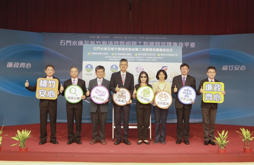 北區水資源局於4日在集會堂舉行「石門水庫至新竹聯通管暨相關工程採購廉政平臺宣示儀式」,經濟部水利署黃宏莆副署長、法務部廉政署孫治遠主任秘書、桃園地檢署俞秀端檢察長、新竹地檢署張云綺檢察長、法務部調查局桃園市調查處李文義處長、新竹縣調查站李秩義主任、經濟部政風處賴俊源簡任秘書及施工廠商等均出席,共同宣示透過跨域合作的力量,藉由廉政平臺建立公開透明良好採購環境,杜絕外力干預,以攜手推動完成這項國家重大水利建設,讓全民共享清廉透明成果。