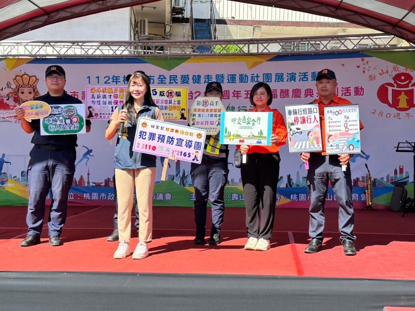 龜山分局結合壽山巖觀音寺及桃園市龜山區體育會10日辦理反毒、反詐騙及交通安全宣導健行活動,為深化市民遵守交通規則、提升民眾反詐意識與婦幼安全觀念,首次出動「龜山宣導團」。112年9月是交通安全月,主題為「人本交通–停讓文化」,透過宣導,讓民眾養成「駕駛車輛慢、看、停,路上行人安全行」的良好習慣,共同維護交通安全。