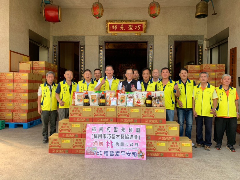 位於蘆竹區的巧聖先師廟主神為魯班公,從事土木建築相關業者為求執業順遂皆會定期祭拜,在地香火鼎盛。桃園巧聖先師廟每年皆會舉辦普渡祈福法會,今年為支持本市安家實物銀行方案,一同實踐公私協力之精神,也將150箱平安箱(市值逾15萬)作為公益捐贈,結合捐獻信眾一同創造社會善循環。平安箱內含白米、鹽、醬油等民生物資,濟助本市弱勢家戶基本餐食照顧及糧食濟助,此批物資將透過安家實物銀行媒合予需要的家戶。