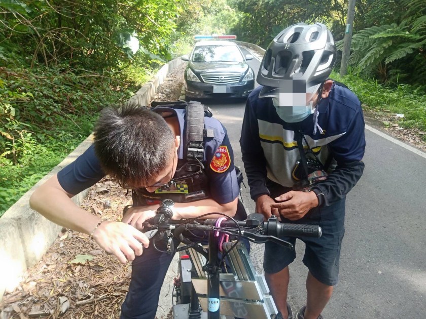 22日上午8時許,坪頂派出所警員林哲民、徐偉皓巡邏途經風尾坑山路,見一名66歲林姓老翁行動不便、吃力地牽著電動自行車下山,感覺有異便下車察看老翁狀況,發現他的電動自行車煞車線卡住而無法煞車,老翁擔心下坡車速太快會有危險只好下車牽行,徐員聽聞後連忙拿出工具幫老翁將煞車修理好,老翁見狀驚呼警察怎麼這麼厲害,二人擔心老翁安全更陪同他一起下山,不僅解決了老翁的困境,也結束了這場下坡驚魂記。