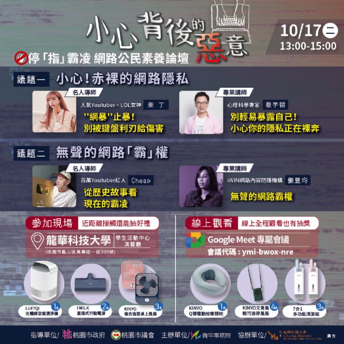 為帶領青年深入瞭解並探討網路霸凌及網路隱私權等相關議題,桃園市政府青年事務局與龍華科技大學合作,將於10月17日在該校學生活動中心演藝廳舉辦「停『指』霸凌!網路公民素養論壇」,現場特別邀請百萬Youtuber「cheap」以及LOL女神「奎丁」分享自身觀點及經歷,此外,知名Podcast「哇塞!心理學」創辦人蔡宇哲博士與「IWIN網路內容防護機構」劉昱均執行秘書也會以專業講師的角色分享實務狀況及經驗,期盼青年學子透過與名人近距離接觸,更瞭解如何面對網路霸凌及隱私侵犯的議題。此活動採取現場報名,名額有限,歡迎青年夥伴踴躍報名參加,當天也會透過線上直播方式,擴大活動參與。