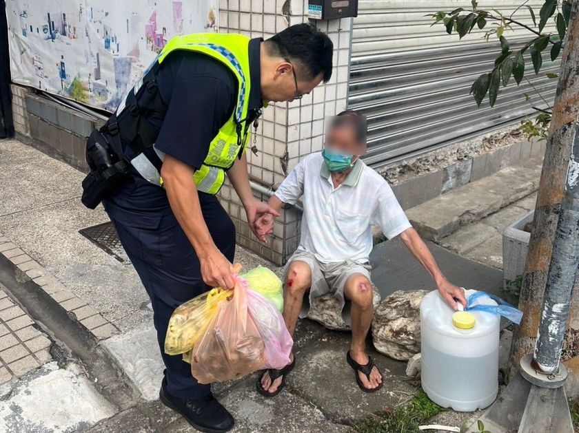 所幸平鎮派出所警員杜炳杰及張瑞峰巡邏經過,見老翁滿身傷痕,立即上前關心,並趕緊攙扶老翁到路旁休息,員警見老翁膝蓋流血受傷,本想通報消防局到場協助救護,但老翁認為只是輕傷,無須浪費救護資源,於是員警向附近店家商借急救箱,所幸經過簡單的消毒包紮,老翁並無大礙。